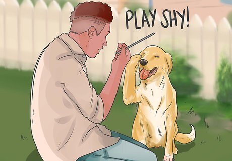 Encourage the behavior by giving a treat when you see it. After about one week of acknowledging and drawing attention to the dog’s natural covering behavior by calling out “Play shy!” whenever you see the dog’s paws over its face, begin testing your pooch to see if he or she has internalized the command yet. Command your dog to play shy and issue a treat if it obeys. If it doesn’t, help your doggie remember how to play shy. Exclaim “Play shy!” Then place one or both of its paws over its face. If you choose to place both paws over the dog’s face, you will first need to get the dog to lie down. Whether you choose to place one or both of the dog’s paws over its face, make sure you do it the same way each time. If choosing to utilize only one paw in the trick, always use the same paw. For instance, if you exclaim “Play shy!” and cover your dog’s eyes with its right paw, do not cover its eyes with its left paw the next time you want it to perform the trick.