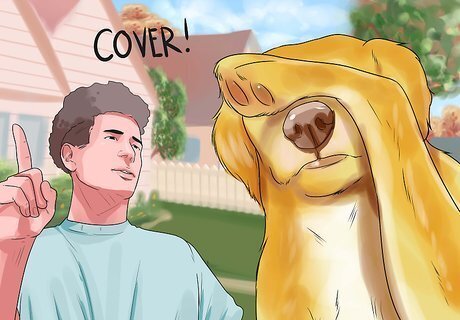 Name the covering behavior when your dog does it naturally. Dogs can understand over a thousand words when trained to interpret them properly. Dogs will often rub their faces or cover their faces with one or both of their paws. When you see this behavior, draw the dog’s attention to it by saying “Play shy!” in a friendly, happy tone. Instead of “Play shy!” you can use a similar cue such as “Cover!” or “Hide!” Whatever verbal cue you use to teach your dog to place its paws over its face, be consistent with it. Do not use two commands to teach the same trick.