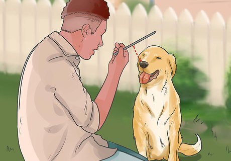 Bring the target closer to the dog’s snout. As you elevate and shorten the target, bring it closer to your dog’s snout, aiming for an area just below its eyes. Once you bring the target object close enough to make contact with the dog’s snout, deploy your cue phrase (“Play shy” or some variation) just before you raise it to the point near your dog's eye. Your dog should, in the final stage, be raising his or her paw to a point where he or she covers or touches this point near the eye. Repeat seven to ten times.