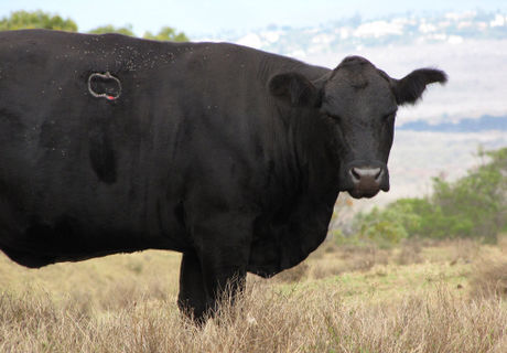 Study the coat colouration of the next picture. Beef cattle, unlike dairy cattle, come in a much wider array of coat colourations and patterns than any dairy breed or cross breed can come out with. You will find in your search beef cattle that range from all black to all blonde, red with white, brown with white, all white, grey, mottled, very spotty, and even coats with both red and white hairs (roan). Black is the most popular colour in beef herds today, with Angus cattle being at the root of it all. Dairy cattle can be all black too, just by crossing breeding a Holstein cow to a Jersey bull (preferably that than a Jersey cow bred to a Holstein bull!), however even these cattle will still have the same musculature as mentioned in step two. Angus cattle, black Simmental, black Limousin, black Gelbvieh, etc. are all identifiable as beef cattle by musculature, bulls especially.