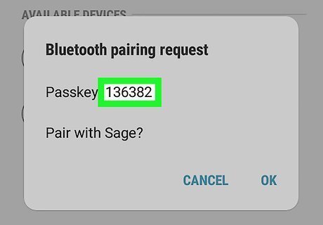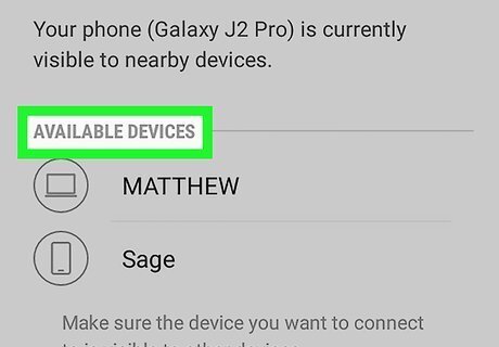 Wait for the device's name to appear. After a moment, you should see the phone's, tablet's, or computer's name pop up in the Bluetooth menu. The name you'll see here will vary, but you can expect to see some variation of the device's manufacturer, product name, and/or serial number.