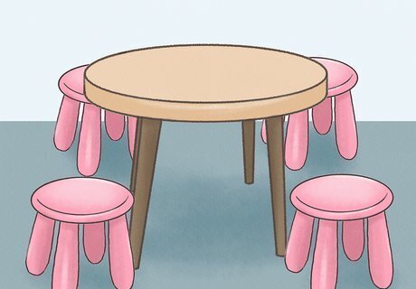 Set up the table and chairs. If the children are old enough to sit at a normal kitchen or dining room table, you can use that. Just be sure it’s large enough to seat everyone you’re inviting. You may need to push a couple tables together if it’s a large group. Rent or buy extra folding chairs if you don’t have enough. For little kids who aren’t quite tall enough to sit at a standard table, try to find child-sized tables and chairs to make it more enjoyable for them. If you don’t want to purchase one of these sets, you could push several sturdy boxes or crates together and have everyone sit on cushions on the floor.