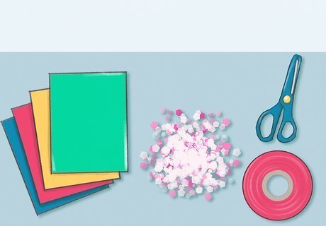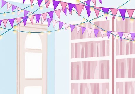 Hang decorations around the room. If it’s a fairy-themed party, hang string lights across the walls and around banisters or bookcases. If it’s a princess-themed party, use large rolls of brown craft paper to create a castle facade on the wall. Top it off with a construction paper dragon or knight. Place extra teapots around the room and put flowers in them for a garden-themed party. For an Alice in Wonderland party, hang lots of clocks on the walls and create oversized playing cards out of construction paper.