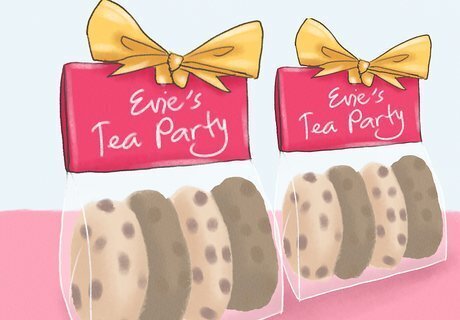Put a treat bag at each place setting. If you want to provide party favors, you can keep it simple by wrapping up little cookies in cellophane and tying it with a nice ribbon. Or buy cheap novelty items like plastic tea cups, stickers, or giant jeweled rings. For an Alice in Wonderland party, fill their favor bags with bottles of bubbles, playing cards, or black headbands that look like Alice's. For a princess party, send them home with plastic tiaras, fun sunglasses, or little stuffed unicorns.