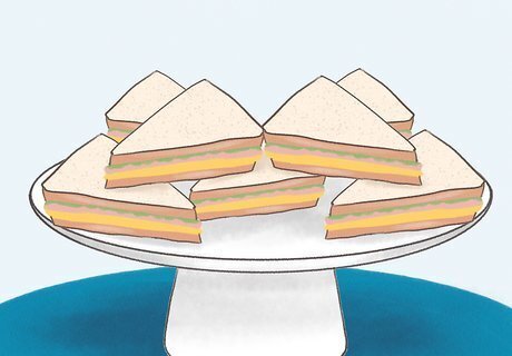 Make finger sandwiches. Make cucumber, chicken salad, or even peanut butter and jelly sandwiches. Cut them in half or into quarters and remove any crust to accommodate picky eaters. These can be made a few hours in advance and stored in the refrigerator until you’re ready to serve them. Place the food onto doilies, cake stands, and tiered dessert stands to create a pretty display. Position them in the center of the table and allow the children to help themselves once they're seated. Or let your child go around and serve each of their friends once the tea is ready.