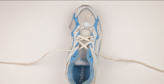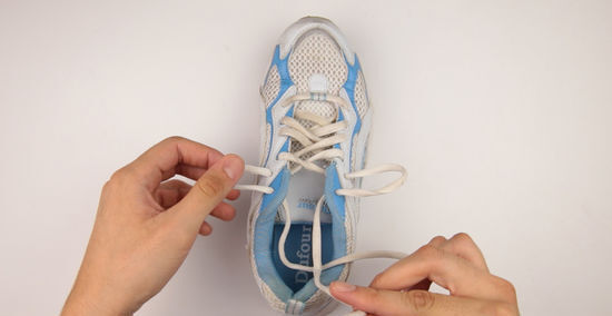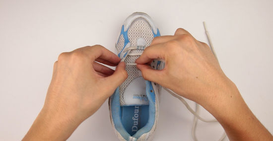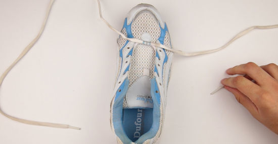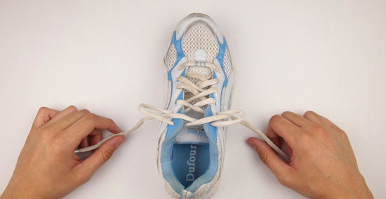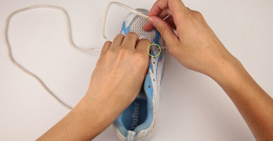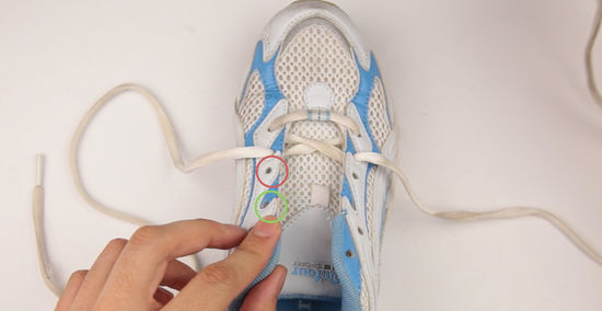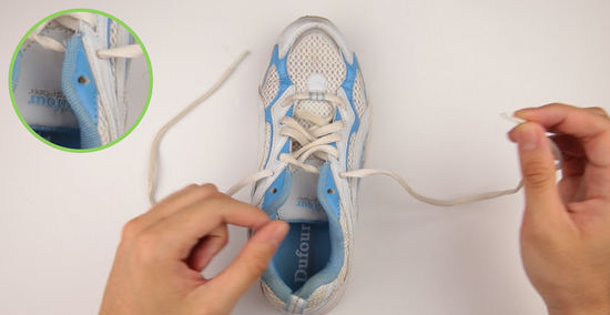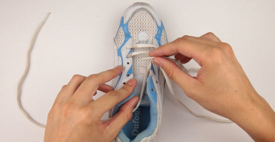 Draw the laces straight across the bottom 2 eyelets. Remove the lace completely. Insert the laces into the bottom two eyelets so that the tips are pointing towards the shoe, then pull the laces taut.