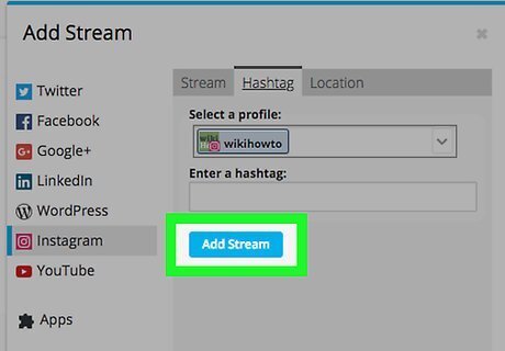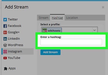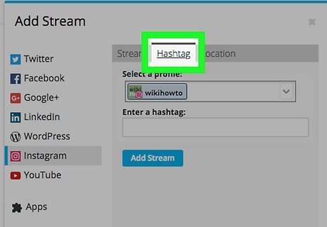 Click on Hashtag. It's in the center of the "Add a Stream" box below your Instagram profile picture.