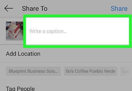 Tap and hold the "Write a caption" of section the photo you want to tag. If you don't have a photo ready, take or upload a picture and edit it to get to Write a caption.
