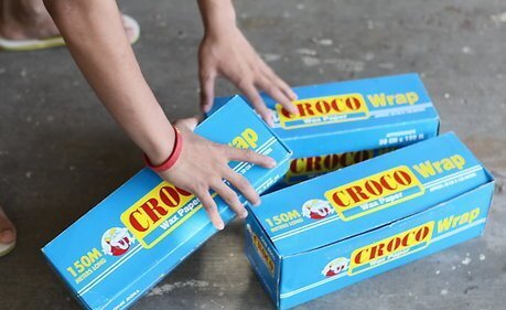 Restrain your dog. Having a friend here is helpful, they are going to hold your dog on leash. Or if you are alone, you can tie the dog back. Pick up one of the boxes and make a show of putting the treats in there, once the dog shows interest, put the box down among the other boxes.