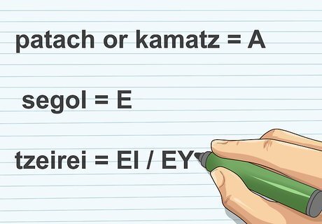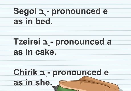 Know the pronunciations of the Hebrew vowels known as nikudot (נְקֻדּוֹת). The nikudot are as follows: Patach בַ - pronounced a as in father. Kamatz בָ - in Ashkenazi dialect, pronounced a as in what. In Sephardi dialect, pronounced like Patach. Segol בֶ - pronounced e as in bed. Tzeirei בֵ - pronounced a as in cake. Chirik בִ - pronounced e as in she. Shva בְ - pronounced i as in bid or with no sound (see Shva below for explanation).