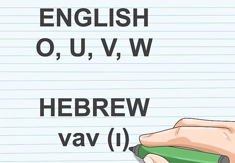 Understand the letter vav (ו). The vav can make the sounds of 4 English letters: O, U, V, and W. A vav with a vowel is typical pronounced as a V followed by the respective vowel sound. A vav with a dot above (displayed as וֹ) is pronounced O as in "rope." It is typically pronounced in conjunction with the previous consonant and treated just like a vowel together with that letter. This is known as a cholam. A vav with a dot to the left (displayed as וּ) is pronounced as U as in "glue."' It is typically pronounced in conjunction with the previous consonant and treated just like a vowel together with that letter. This is known as a shuruk. The letter vav is used to represent the English letter W. Though common dialects of Hebrew do not have a W sound, vav is used for loanwords in modern Israeli Hebrew.