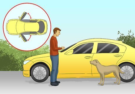 Introduce your dog to the car. If your dog is particularly fearful of cars or if it has never been in one before, you'll need to do some basic desensitization work. This should entail getting your dog familiar with being in the vehicle, even if it is not yet comfortable being in there for prolonged periods of time. Start by getting your dog used to being near the car. After your dog can be near the car, open both rear doors so that your dog can see there is a way out. Seeing that it won't be trapped may help alleviate some of your dog's fears. Put your dog on a leash and climb in on one side. Without saying anything, gently tug the leash to lead your dog into the backseat. Slide all the way over and get out on the other side, making sure your dog comes right behind you. Quickly return to the other side and repeat the process until your dog can get in and out comfortably. You may also want to reverse which side you enter and exit on so your dog gets used to both sides of the vehicle. If you have a hatchback or "boot" on your car, keep the rear door open and begin alternating between the backseat and the rear of the vehicle.