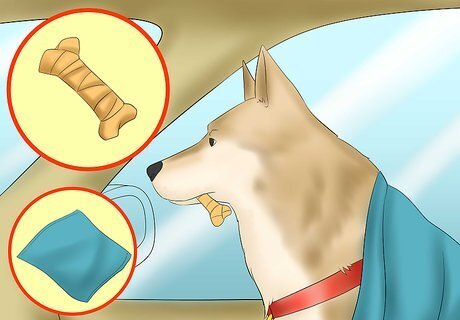 Create a safe and comfortable environment. Ideally, you should create a comfortable little refuge in the car for your dog. This can help make your dog calmer and feel more at ease during travel. Many dog owners use a crate for this reason, but you can achieve the same effect without one. Bring one of your dog's favorite toys, a familiar blanket, and anything else that will help put your dog at ease. Play some soothing music in your vehicle. This can help calm your dog once it gets inside the car.