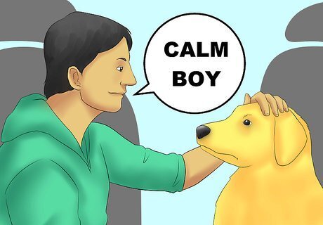 Identify and address anxiety triggers. Some dogs have specific travel-related things that cause anxiety. For example, some dogs get fearful when the vehicle drives over rumble strips or comes to a complete stop. It will take some time and experience in the car to determine what (if any) specific triggers your dog has. Be patient and offer support as best you can. Speak in a calm, reassuring voice before, during, and after the trigger. If you're traveling with another passenger, have them offer your dog treats after your dog experiences any of its anxiety triggers in the car. Try to avoid those triggers as best you can in the future, but make sure you prioritize road safety. If you can't safely avoid a trigger, do not attempt to do so.