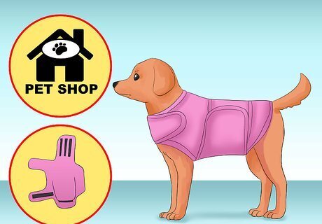Use an anti-anxiety wrap. Anti-anxiety wraps are worn by anxious dogs to naturally calm them down during stressful situations. An anti-anxiety wrap gives your dog a gentle yet un-intrusive squeeze, which may provide some relief for your pet. You can purchase anti-anxiety wraps from many pet stores or through an online retailer.