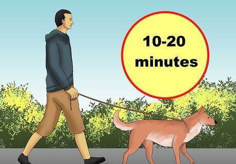 Walk your dog before travel. Walking your dog can help lower its stress levels and increase its sense of calm. A good, long walk will also reduce the risk of your dog urinating or defecating in the vehicle. Give your dog a good, long walk. Try to walk your dog for whatever time and/or distance you usually cover during a typical walk, but make sure it's more than just being let outside to urinate. Aim to walk your dog approximately 10 to 20 minutes before departure. That way your dog will still be calm when you approach your vehicle.