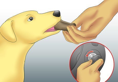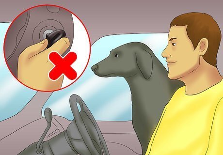 Start the engine. Now that your dog is comfortable being inside the vehicle, the next step is adding the sound and feel of a running engine. This may frighten some dogs, even those that have been calm up to this point. Be patient and make sure your dog is doing okay at every step of the way. Make sure your dog is already used to being in a stationary vehicle before turning the engine on. Your dog should have spent about one to two weeks, or as long as necessary, simply sitting in your vehicle. Continue offering treats and/or feeding your dog in the vehicle. Start the engine while your dog is already inside, then immediately offer food or treats. Watch your dog's reaction. If it seems anxious or upset, offer even more petting and verbal praise, being sure to speak in a calm, soothing voice. Be sure your dog is as relaxed and calm as possible before you end each session with the engine running.