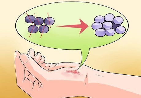 Understand staph infections. Staphylococci, more commonly referred to as “staph,” are gram-positive cocci in clusters. The “gram” in gram-positive refers to the gram stain pattern of the bacteria when viewed under the microscope. The “cocci” indicates the shape when viewed under a microscope. This types of bacteria usually invades the body through a cut or wound. Staph aureus is the most common type of staph infection. Staph aureus may cause pneumonia, food poisoning, skin infections, blood poisoning, or toxic shock syndrome. MRSA (methicillin-resistant Staphylococcus aureus) is a staph infection that is hard to treat. MRSA does not respond to some antibiotics and it is thought that the strain developed in response to antibiotics. Therefore, many doctors will not prescribe antibiotics unless it is absolutely necessary.