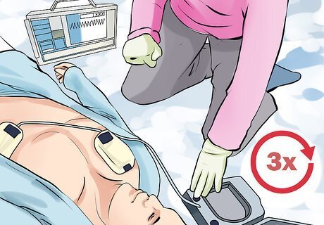 Give shocks if the victim has no vital signs. In stage 4 hypothermia, the victim is unconscious and has no vital signs – they aren’t breathing and/or they don’t have a pulse. Most likely, you will not have a defibrillating device with you, in which case provide CPR for as long as you can, giving good rescue breaths. If you do have a defibrillating device, check the person’s ECG. If they are in ventricular fibrillation (V Fib), give them up to 3 shocks to try to restore a regular heartbeat. If you are a medical professional and you are able to establish an IV line, infuse fluids warmed to 42°-44°C (108°-111°F). The standard is 0.9% NaCl or 5% glucose.