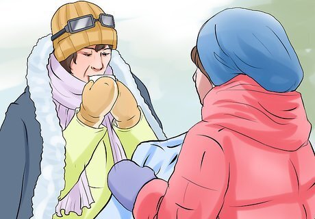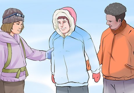 Keep the victim moving if they are up and conscious. Someone with stage 1 hypothermia will be conscious and shivering. If the victim is uninjured enough to be standing, have them move around to keep as warm as possible. Insulate their body with more clothes or thermal wraps (you should pack these when adventuring in cold climates), and shield them from the wind. Give them warm fluids to drink, if you have any. The goal is not to actively re-warm them at this time, but to prevent any further drop in core body temperature.