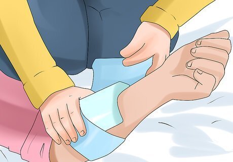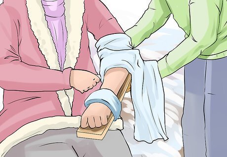 Splint an injured limb. In the event of a broken arm or leg or injured joint, try to apply a splint to minimize pain and further injury and make safe travel easier. Follow these basic guidelines for splinting an injured limb: Locate a strong, straight object to use as a splint. It can be a log, branch, rolled up towel, or anything else at your disposal. If using something from nature that may splinter, wrap it in extra clothing. Gently wrap the injured limb in padding, such as extra clothes. Apply the splint so it overlaps the joints above and below the injury. For instance, if the lower leg is injured, the splint should overlap both the knee and the ankle. Place the splint on the uninjured side of the limb (i.e. not over the injury), if possible. Secure the splint with ties or tape above and below the joints. Do not tie something directly over the injury, and try not to tape directly on the victim’s skin. Move the injured limb as little as possible. If the person expresses pain, numbness, or tingling in the extremity after splinting, remove the splint and try again. Impeding blood flow with a splint can cause long-term damage to the limb.