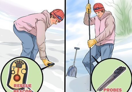 Locate the injured or buried victim. When adventuring in areas that have a danger of avalanches, always pack basic safety equipment. Each person should have a rescue beacon that is battery powered and can send out a GPS coordinate. Bring a small snow shovel for digging, and a set of long, collapsible poles known as probes. Use your equipment to locate a buried or injured person by following the GPS signal or cries for help, and probing the snow with your poles to locate them. Make sure the batteries are fresh in your rescue beacon. Also be sure you know how to use it properly.