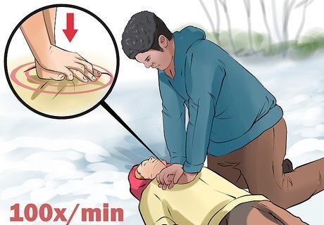 Provide good chest compressions, if the victim is unconscious. Start CPR on the unconscious victim by doing chest compressions. Perform quality compressions by following these guidelines: Place your hands in the middle of the person’s chest, one hand on top of the other, with the heel of your hand against their chest over the sternum (the flat bone between the ribs in the middle of the chest). Lean forward over the person so your arms are straight. Use your bodyweight to help you do compressions. Compress the victim’s chest with the heels of your hands to a depth of 2 inches (about 5 cm). Compress the chest 100 times per minute. This depth and rate can be tiring – you should feel resistance.