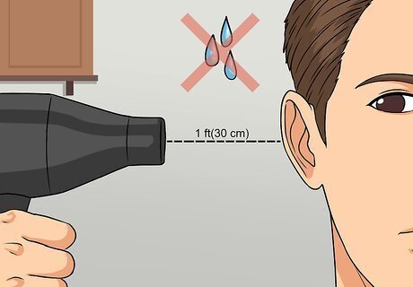 Avoid getting your ear wet. Use caution when taking a bath or shower, and try not to get any water directly into your ears. Dry off afterward, so no water is lingering in your ear. If you get water in your ears, use a towel to wipe them out carefully. You can also hold a hair dryer by your ear at low heat to evaporate any extra water. If you do this, be sure to hold the dryer at least 1 ft (30 cm) away from your wet ear. Keep it on for a few minutes and see if your ear feels any drier!