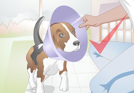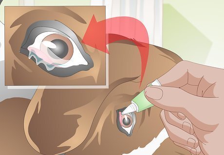 Keep your dog in a cone after surgery. The vet will probably recommend putting your dog in an Elizabethan collar or cone until the eyes have healed, usually about 2 weeks after surgery. If your dog also had corneal ulcer surgery, it may have gotten a drain put in place. Follow your vet's recommendations for cleaning and maintaining the drain. Be sure to go to follow up appointments with the vet. This way, the vet can monitor your dog's healing and adjust any medications your dog is taking.