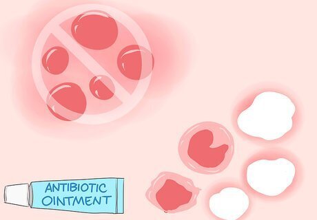 Leave blisters alone, but treat broken blisters with antibiotic ointment. Don’t pick or break your blisters. This can cause an infection. However, it’s normal for blisters to break on their own. When this happens, apply an antibiotic ointment and a sterile bandage with non-stick gauze. Change the bandage every 6 hours or when it comes off. If your blisters have discolored or smelly pus, go see your doctor. This might be a sign of an infection.