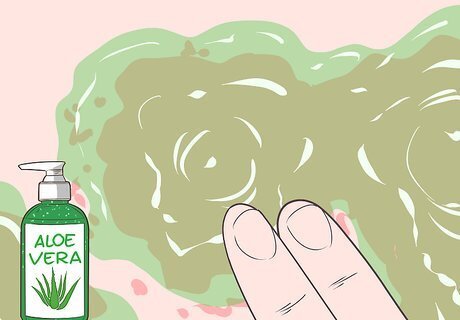 Use aloe vera gel to soothe the burned skin and help with peeling. Put a dab of aloe vera gel onto your hands, then gently apply it over your sunburn. Let the aloe vera sit on top of your skin, rather than rubbing it in, which can cause irritation. The gel will seep into your skin on its own. You can use aloe vera gel from an aloe vera plant by breaking off a leaf and collecting the gel that comes out. Alternatively, buy a container of aloe vera gel from your local drug store or online. Just check the ingredients to make sure it’s at least 90% aloe vera.