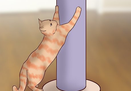 Provide your cat with scratching posts. Scratching posts benefit cats in several ways. They allow cats to stretch their muscles, mark their territory, and simply do something fun. Putting several scratching posts throughout your home will give your cat a great way to keep itself entertained while you’re away. Pick a vertical scratching post that’s about 2 feet tall. Horizontal scratching posts are available, but cats tend to prefer scratching on a vertical post. Place the post in an area where your cat spends a lot of time, such as its bed or a window perch.