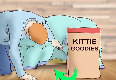Hide treats throughout your home. Before you leave home, take a few of your cat’s treats and hide them in different places (e.g., under a piece of furniture, in the corner of a room). Your cat will have fun using her nose to find the food, rather than going straight to her food bowl. Place the treats in different places each day so your cat has a new daily challenge to find the treats. Because treats can be high in fat and cause weight gain, consider hiding small amounts of your cat’s regular food instead. At the end of the day, pick up any food your cat didn't find. You could also put your cat’s daily food ration in a puzzle feeder.