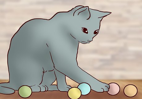 Give your cat a variety of toys. The more toys your cat has to play with, the better! They will keep your cat physically and mentally busy, which will lessen the separation anxiety. Rotate the toys regularly so your cat doesn’t get bored with the same set of toys. One great toy for cats is a food dispenser toy. Other great toys for cats include: Toys that make noise or vibrate Ping pong balls Old cotton socks stuffed with cotton balls or some catnip (make a knot at the open end of the sock) Crumpled up paper balls