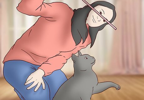 Use interactive cat toys during playtime. Your cat will enjoy playing with interactive toys. Wands or plastic sticks with toys (e.g., little toy mouse) attached to the end are great interactive toys for cats. Laser toys are also good for playtime. Move the laser beam around on the floor and watch your cat try to ‘catch’ the beam. Make sure you don’t flash the laser directly in your cat’s eyes.