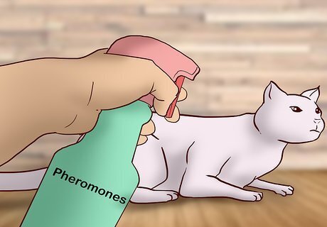 Spray a cat pheromone product in your home. Animals produce substances called pheromones. They release the pheromones to communicate with each other and affect the behavior of other animals. Synthetic cat pheromone products, such as Feliway®, help cats feel less anxious in their environment. Spray Feliway® in your home to help relieve your cat’s separation anxiety. Follow product label instructions when using Feliway®.