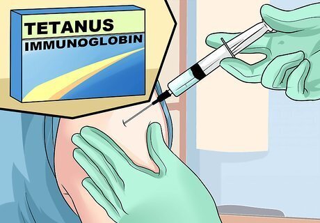 Get a shot of tetanus antitoxin. Depending on the time between your injury and when you start to show obvious symptoms, your doctor may give you a tetanus antitoxin injection, such as tetanus immune globulin. This is not a cure, however, and can only neutralize "free" toxins that have not bonded to nerve tissue. Any toxins that have already bonded to nerve tissue will not be affected. As such, time is of the essence. The sooner you get to the doctor (once you notice symptoms) the more effective the immunoglobulin will be in preventing the severity of symptoms. You will be given a dose of 3000 to 6000 units intramuscularly as soon as the diagnosis of tetanus is made. In countries in which IG is not available, equine antitoxin is used. Don't wait for symptoms. If you get a deep injury (such as a puncture wound) from something sharp that appears contaminated with soil, rust, feces or other debris, then clean the wound and get a tetanus shot shot from your doctor or an urgent care clinic as a preventative strategy.