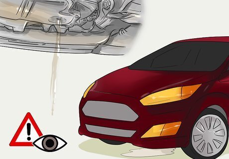 Look for leaking transmission fluid. A common cause of issues with automatic transmissions is low fluid levels caused by leaks. Look beneath your vehicle for wet spots. If you find one, touch it with your finger, then wipe your finger on a white sheet of paper to determine what kind of fluid it is by color. Automatic transmission fluid is usually red, or dark red if it is old and has been burned. Coolant is usually green or orange. Oil is usually brown or black.