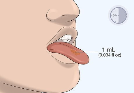 Hold 1 mL (0.034 fl oz) of THC tincture under your tongue for 30 seconds. Check the label first to ensure that this is the suggested dose. Don’t swallow the THC tincture right away. Open your mouth, lift your tongue, and drop the desired amount of liquid THC onto the floor of your mouth. Let the THC sit under your tongue for 30 seconds while it absorbs. This will get the THC into your bloodstream faster than if you consume the dose in food, beverage, or pill form.