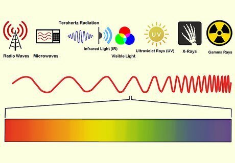 Begin with naming all the parts. There are 8 parts to the Electromagnetic Spectrum. They are: Radio Waves Microwaves Terahertz Radiation Infrared Light (IR) Visible Light Ultraviolet Rays (UV) X-Rays Gamma Rays By understanding these names, you will need to know its range. Below is showing a table of the range.