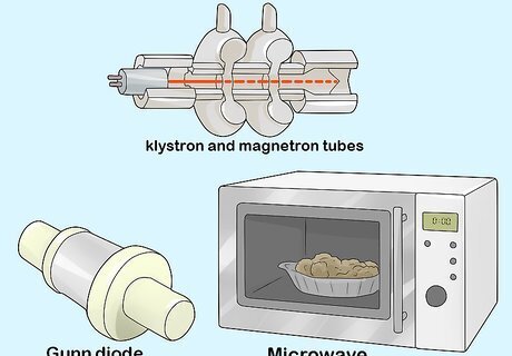 Learn what items use microwaves. Certain objects use this kind of radiation, but not very many (at least not as many as radio waves). Microwave energy is produced with klystron and magnetron tubes, and with solid state diodes such as Gunn and IMPATT devices. Microwaves use microwaves to heat up food. They are actually absorbed by the water, sugar, and fat in the food, and that is why they heat up. The plate stays cool since it doesn't have any water or fat. The power level varies on the energy of the microwave.