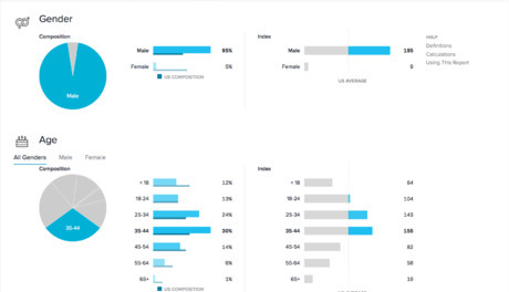 Understand the concepts of composition and index. For any dimension (such as age, gender, ethnicity, income bucket) we can consider the composition of your website visitors based on that dimension. Consider gender, the simplest example of a dimension you might be interested in. The composition of your website visitors by gender will read something like "45% male, 55% female." Composition data is available in GA and QM for any dimension that is being tracked. Another idea related to composition is that of the index (as Quantcast calls it). The index becomes relevant when the overall sizes of the populations for various values of the dimension are different. For instance, in the United States, African-Americans constitute 13% of the population. Thus, a website that gets 26% of its traffic from African-Americans is over-represented among them (also known as "over-indexed"), even though they are still a minority of users. The index is essentially the ratio of the composition among website visitors to composition in the overall population, expressed as a percentage (i.e., out of 100), though usually quoted without the "%" sign in front. So in this case (with 26% of website traffic from a subpopulation that is 13% of the population), the index is 26%/13% * 100 = 200. An index above 100 means the subpopulation is over-indexed, whereas an index less than 100 means the subpopulation is under-indexed. Unlike composition, that can be inferred purely based on the visitors to the website, the index requires the use of data for a general population. Moreover, the index can be different depending on what general population we use for benchmarking. For instance, for a local news website for a city, do we use the population of the city, or the population of the country, or world population? Do we restrict to people with Internet access, or to all people? Note that for large subpopulations, the index has a ceiling effect. For instance, non-Hispanic whites in the United States are 62% of the population, so even if a website gets 100% of its traffic from non-Hispanic whites, the index is still only 161. On the other hand, for a subpopulation that is only 5% of the whole population, the index could be as high as 2000. The distinction between index and composition is less important when looking at gender, especially in developed countries, because the number of men and women using the Internet is almost equal.