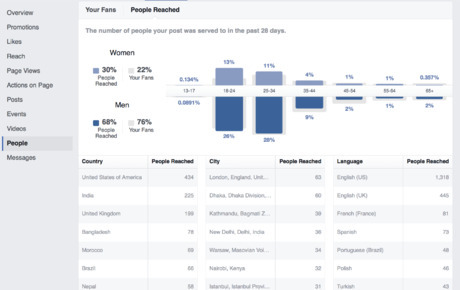 If you have an associated Facebook page, retrieve from FBI the geographical locations (top countries and cities) for the people who have liked and recently been reached by your page. The "Your Fans" option shows cumulative data on all people who have liked your page. The "People Reached" option shows data on people reached in the past 28 days (deduplicated, so even if a person is reached multiple times, that person is shown only once).