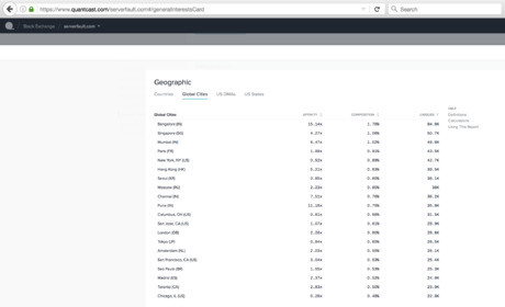 Compare your website's top countries and cities against the top countries and cities of other websites of the same kind, using the following general rules based on the website's domain. Technology Q&A sites tend to have fairly global audiences, and (interestingly) report extremely high composition and index in a few Indian cities (Bangalore, Chennai, Mumbai, Pune, and to a lesser extent, Delhi), Seoul (South Korea), Moscow (Russia), Hong Kong, Singapore, London, Shanghai, and San Francisco. Although major global cities such as New York City also contribute a large share of users, their affinity is relatively lower and for some sites, even lower than 1. Educational websites are a little trickier to predict. Some of them have global appeal, whereas others appeal only within specific territories, even if their content is global in principle. In general, websites that cater to people at lower education levels are likely to have more regionally limited appeal (because education at lower levels is more constrained by linguistic and cultural barriers, and minor differences in syllabi and notation, and there is also a larger plethora of online resources in different languages). Thus, for instance, the top cities for algebra.com (focused on middle-school and high-school mathematics) are all in the United States, whereas those for Math StackExchange and MathOverflow are more global in nature. Politics news websites have high affinity with the regions whose politics are the focus of the sites. Sites that cover global news, such as CNN, have a fairly global audience, although they are still concentrated more in the countries where they originated. In contrast, a site such as Politico or Talking Points Memo, which is almost exclusively focused on United States politics, gets most of its readers from the United States. At the city level, the capital city would have the highest affinity among all cities (in the United States, this is Washington, D.C.). For global news websites such as CNN, capital cities across the world, as well as city-states such as Singapore, would have the highest affinity. For websites with coverage of restaurants, New York City, Seattle, Boston, and San Francisco tend to have the highest affinity among major cities. Since the cities other than New York City has a small population, it still ranks quite low in composition. The greater affinity of Seattle, Boston, and San Francisco may be explained by their greater ethnic diversity as well as their role as tech hubs, with a lot of the food-focused websites built by technology companies collaborating with restaurants. The older the site, the less heavy its affinity for new, tech-savvy cities. The appeal of fashion websites tends to be quite region-specific. For instance, a fashion website such as Refinery29 or the Zoe Report gets the majority of traffic from the United States (this is also one reason that fashion websites that aim for international audiences need to maintain different versions for the audiences in different regions). In general, fashion websites tend to have higher affinity on cities, even cities (such as Los Angeles) where most other websites have low affinity. However, the affinity is related more to income levels (and therefore more in cities with higher median incomes) than it is to our conception of how much the region has an interest in fashion (thus, for instance, San Francisco has a much higher affinity than Los Angeles).