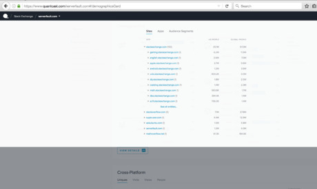 Compare your website against example websites for benchmarking, that match it as closely as possible along the most relevant criteria. Since websites do not usually share their GA data, your best option for getting good benchmarks is Quantcast data. You can access Quantcast data for a website by typing in quantcast.com/domainname (you can exclude initial "www." from the domain name). Many websites do not use QM. Others use QM but make only some of the data visible to the public. You should scroll down to the section on demographic data to see if the website has allowed for sharing the information. One key limitation of Quantcast is that most of the websites that share data with Quantcast and allow Quantcast to show the data publicly tend to be media websites whose business model is advertising-based. Moreover, most of them are either based in on have a significant presence in the United States, since Quantcast data is most reliable and most useful to show to advertisers for United States audiences. In particular, if the topic of your website is not one that media companies and publishing groups have interest in, it can be hard to find examples to benchmark against. Another thing to keep in mind regarding the availability of Quantcast data is that the decision to share data with Quantcast is made at the level of the media company or publishing group, rather than the individual website. Therefore, either all (or most) of the websites under a given publishing group would have QM data publicly visible, or none would. Some publishing groups and companies that have publicly available QM data for most of their sites include: the Stack Exchange Network (Stack Overflow and all Stack Exchange sites), Tegna, Woven Digital (Uproxx, Brobible, and some other male-focused humor and celebrity news sites), Vox Media Network (Vox, Eater, Racked, and a few other sites), Onion Media Network (The Onion and sister sites), COED Media Group Network (COED, College Candy, and Busted Coverage), Bonnier Corporation Network (many outdoors sporting sites as well as popsci.com), and Idle Media (HipHopEarly and sister sites). Quantcast data is available for most websites on the Stack Exchange Network. Therefore, looking for the closest site on the Stack Exchange network to your site can provide some insight. However, Stack Exchange sites are Q&A sites and traffic patterns to Q&A sites differ from those to other sites covering the same topics. The adjustments for different demographic dimensions are discussed at more length later in this guide. In order to better understand whether GA and QM data might diverge for sites like yours, you could turn on QM on your own site for a while and then compare that data against GA data for your own site. If the two are in agreement, then the numbers are likely to be reliable for other websites in your category.