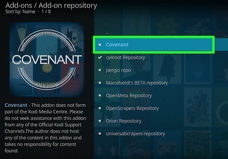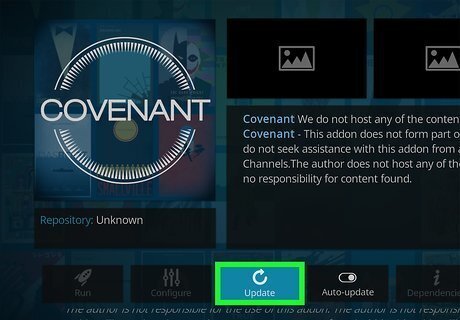Open Kodi. You'll find this in your Windows Start menu or your Mac's Applications folder. Covenant is set to update automatically when you first install the add-on. If you disabled this feature, this method will help you run a manual update and re-enable automatic updates if desired.