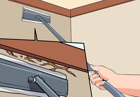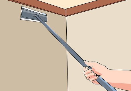 Dust walls and hard-to-reach areas. Use your Swiffer on more than just your floors. Take advantage of the easy handle and cleaning cloth to reach high-up or vertical surfaces of your home. Try dusting dirty walls, baseboards, ceiling fans, cabinets, and more with a dry cloth on the Swiffer. Check to see how a given surface will respond to cleaner before using a wet cloth for this. Remember that you can use the edge of the Swiffer head to gently scrub at more stubborn spots or dust. Just rotate the head until the edge rests against the surface you want to clean.