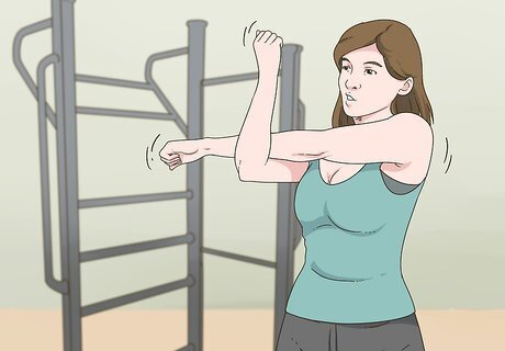 Try some bench dips. Another common piece of exercise equipment in an outdoor gym is the bench dip. This piece of equipment is a short bench with two sets of bars at different heights. Grasp the set of bars that you feel the most comfortable with, keeping your feet straight out in front of you. Bend your elbows to lower yourself down to the seat without touching it. Then raise yourself back up, keeping your heels on the ground. If you are a beginner, try to do one to two sets of 10 to 12 dips. If you are a more advanced exerciser, consider three sets of 15 to 20 reps.