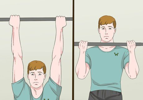 Use the pull-up station. Possibly the most common workout station in an outdoor gym, the pull-up or chin up station helps you strengthen your arms, shoulders, back, and core. Simply grab the vertical bar or hand holds with both hands and pull yourself up towards the bar. If you are unable to do a traditional pull-up, the station may also have a reclining pull-up bar. Because pull-ups are more difficult, you may only be able to do a few at first. If you are a beginner, consider using the reclining pull-up bar at first and work your way up to the regular bar. Start with two sets of 10 to 15 reps and work your way up to four sets of 15 to 20 reps. A more advanced outdoor gym may have a back pull down station. This piece of equipment uses your own weight as resistance and works many of the same muscle groups as a traditional pull-up.