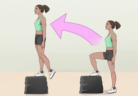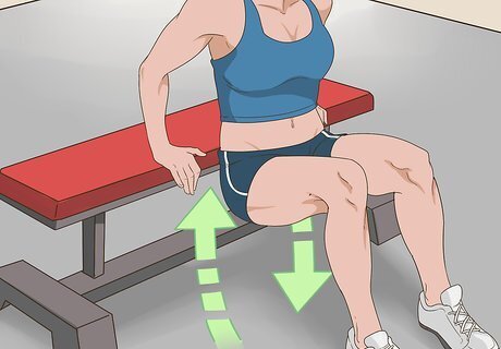 Do some step-ups. Building leg strength is an important part of staying healthy and preventing injuries. Your outdoor gym may have some platforms or steps for you to do some step-ups. For a step-up, alternate stepping up onto the step platform as if you are going up a flight of stairs. This is a great resistance and cardio workout. Start with two one-minute sets and work your way up to two three-minute sets. A more advanced outdoor gym may have resistance equipment like leg press machines that strengthen your legs using your own weight. As you get more comfortable with the stepping, you might consider trying plyometric jumps if boxes are available at the gym.